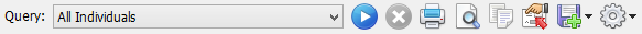 Displays the name of the current query. The dropdown listbox contains a list of all existing queries, including both standard queries (included as part of the installation), and custom queries. |