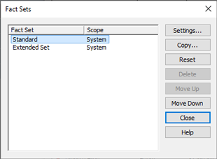 | Delete | Only custom fact sets can be deleted. Be careful before deleting any fact sets as this cannot be undone and, if they are system level fact sets, the change will affect all projects on your computer (see note above). |