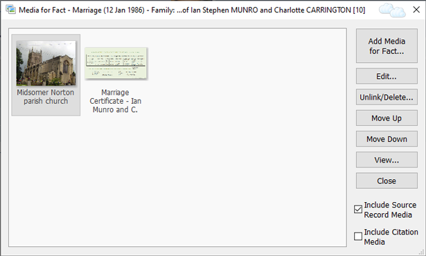 | Include Source Record Media | When displaying Fact media only. If ticked, and if there are source citations for the current fact, media for all the associated Source records will also be displayed. Note: The Move Up/Down buttons are not applicable for these media items. |