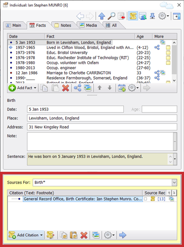 | Sources For | This lists all the fields in the record which contain data, and for which a source can be cited. Some subfields cannot be given separate source citations. For example, a single source citation is used for both the place and date of birth. If the source citation only applies to one of these, this fact should be noted in the Note field. |