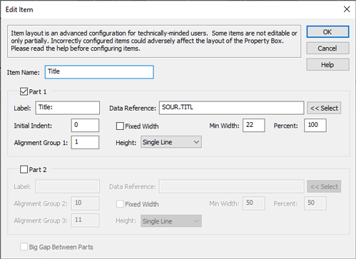 For convenience, the text of this page will sometimes only refer to customizing the Property Box. However, whether explicitly mentioned or not, all text here applies equally to customizing the Citation Window.