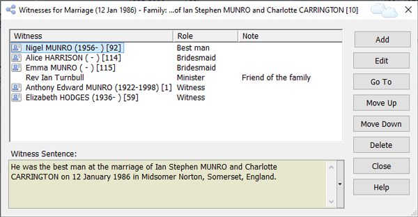 | Move Up | Move the selected witness(es) up. You could use this to, for example, change the order of bridesmaids at a wedding. |